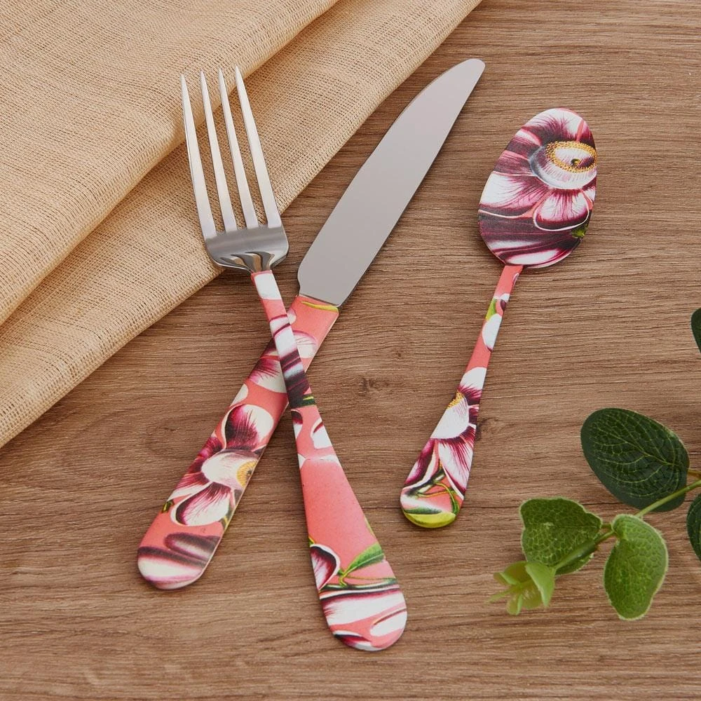 This Wallace Vintage Botanical 3 Piece Flatware Set features outstanding pink and printed floral artwork on stainless steel, and it will add a lovely, decorative touch to your table setting.